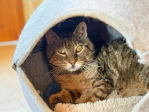 Paula (dunkel) ist eine zurückhaltende Katzendame, die viel Liebe braucht. Sie hält sich anfangs gerne im Hintergrund, doch mit Geduld und Zuwendung wird sie zutraulicher und zeigt ihre verschmuste Seite.