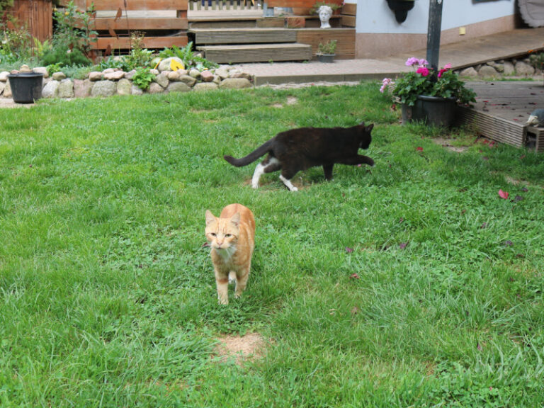 Glücklicherweise verlief die Genesung aller „Patienten“ komplikationslos und endlich konnten wir die Miezen in die Freiheit entlassen. Nun können sie ihrer Wege gehen oder auch bei uns bleiben. Wir haben nun eine weitere Futterstelle auf dem Grundstück eingerichtet, damit für alle ausreichend Nahrung zur Verfügung steht. Doch bekanntlich machen ja Katzen gern ihr „eigenes Ding“…