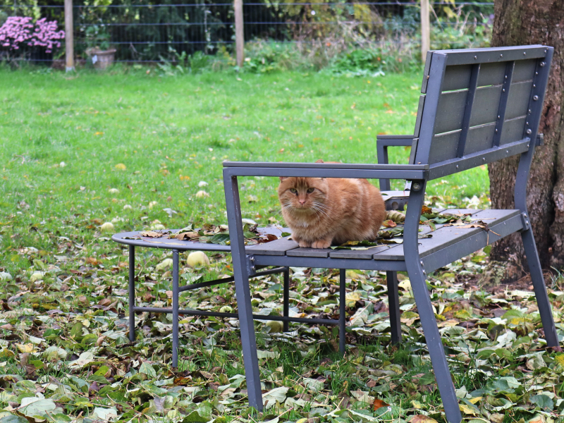 Einige Wochen vergingen und auf einmal erschien der junge Mann wieder an der Futterstelle und fiel natürlich gleich wegen seiner schönen Fellzeichung auf. Nach und nach blieb er immer mehr in unserer Nähe. Nun sitzt er den ganzen Tag über auf dem Kratzbaum, der im Hauseingang steht oder er ist im Garten unterwegs.