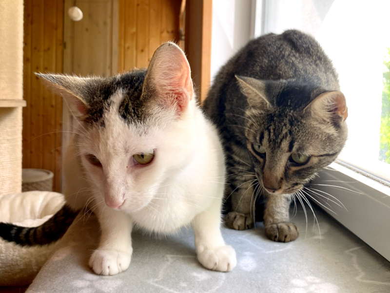 Die beiden wurden als winzige Katzenbabys durch den Familienhund im Gebüsch gefunden, was ihnen das Leben rettete. Die Kleinen wurden mühevoll aufgepäppelt und haben sich gut entwickelt. Mietz ist die „Mutige“ von beiden und Mautz orientiert sich sehr stark an ihrer Schwester.