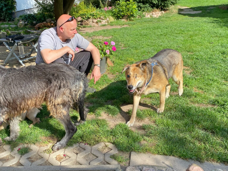 Die Zusammenführung mit einigen unserer Hunde verlief gut. Da ja alle recht nett zu anderen sind, gab es keinerlei Gegrummel, auch wenn Melly ihnen direkt vor die Nase lief. Die kleine Maus wurde von Tag zu Tag sicherer und nach einer Woche bei uns freute sie sich schon, wenn sie an der Reaktion der anderen Hunde merkte, dass nun das Futter gebracht wird.