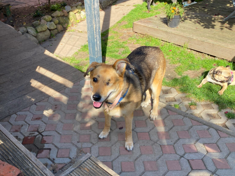 Nun ist bei der Kleinen endlich „der Knoten geplatzt“. Freudig, aber auch vorsichtig, bewegt sie sich überall auf dem Grundstück. Auch das Gassigehen klappt nun schon ganz gut und aufgeregt beschnüffelt sie die Gegend.