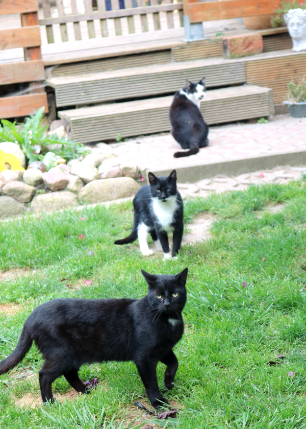 Glücklicherweise verlief die Genesung aller „Patienten“ komplikationslos und endlich konnten wir die Miezen in die Freiheit entlassen. Nun können sie ihrer Wege gehen oder auch bei uns bleiben. Wir haben nun eine weitere Futterstelle auf dem Grundstück eingerichtet, damit für alle ausreichend Nahrung zur Verfügung steht. Doch bekanntlich machen ja Katzen gern ihr „eigenes Ding“…