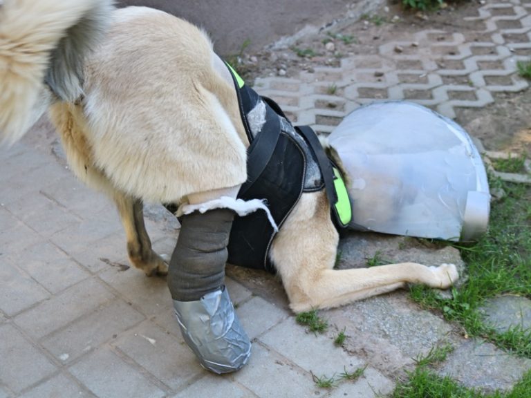 Zurück auf dem Gnadenhof machte die Patientin nicht den Eindruck, dass es ihr schlecht ginge. Vor Übermut schlug sie sogar Purzelbäume und wir hatten zu tun, ihre unendliche Energie zu drosseln. Pamukelchen hält gar nichts von Schonung und Ruhe, diverse „Trichter“ gehen zu Bruch oder sie benutzt ihn als Schaufel um an etwas heranzukommen und es zu zerbeißen. Glücklicherweise kann man sie dadurch mit Kauknochen beschäftigen und müde machen. Im Verbandwechsel sind wir auch bestens geübt, denn durch ihr Gewusel löst sich dieser oftmals. Wir hoffen sehr, dass sich die ganze Mühe für das liebenswerte Pamukelchen gelohnt hat und bald schon die ersten Spaziergänge in der Hundegruppe erfolgen können.