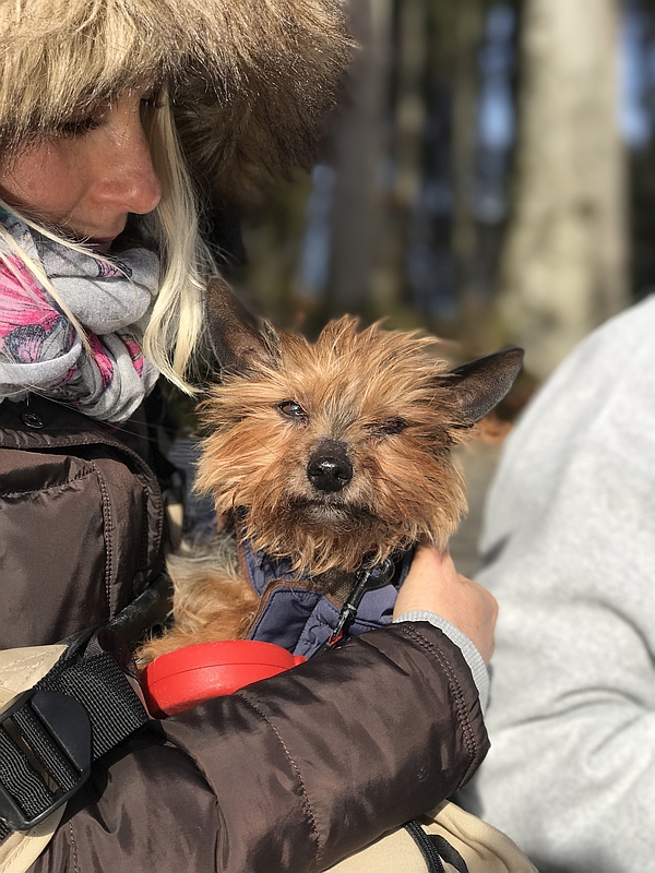 Wir versuchen Penny nun zu zeigen, dass Vertrauen und Liebe zwischen Mensch & Tier wieder alltäglich und lebenslang sein können. Die kleine sensible Maus lernt gerade wieder das unbeschwerte Kuscheln und sie ist selbstverständlich bei unseren Ausflügen mit dabei. Und wenn den kleinen Pfötchen nach ca. 1 Stunde die Kraft fehlt, kommt sie kurzerhand in ihr Täschchen, von wo aus sie den vollen Überblick behält. Denn Penny liebt ihre Artgenossen und blüht bei Begegnungen, vor allem mit kleinen Hunden, richtig auf. Danach muss es aber auch ein ausgiebiges Schläferstündchen mit ganz viel Träumerei sein. Penny liebt die Ruhe und fordert außer einer leckeren Mahlzeit und einem warmen Plätzchen rein gar nichts. Sie kann problemlos einige Stunden alleine bleiben, bevor sich ihre Blase meldet. Gesundheitlich geht es der Kleinen auch wieder gut und nun wünschen wir uns für diese betagte und sehr zurückgezogene Yorki-Dame nochmal ein eigenes kuscheliges Zuhause bei tierlieben Menschen, die viel Zeit mit ihr verbringen. Mit ein oder zwei kleinen Hunden im Haushalt wäre für Penny das Glück perfekt.