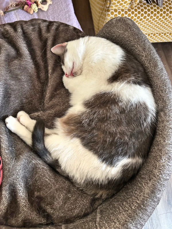 Bei schönem Wetter liegt sie im Garten ansonsten hat sie verschiedene Lieblingsplätze im Haus (s. Bilder).