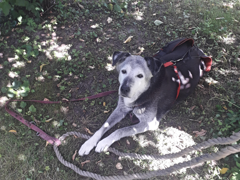 mit der Evi lasse ich es nun ruhiger angehen. Sie ist nun schon eine Oma. Aber sie legt auch noch vernünftige Spaziergänge zurück. Aber ich passe auf, dass es ihr nicht zuviel wird. Am schönsten ist es für sie, im Gras zu liegen oder sich eine Kuhle zu graben. Wir verbringen soviel Zeit wie möglich an der frischen Luft. Das ist das Schönste für sie und tut auch mir gut.