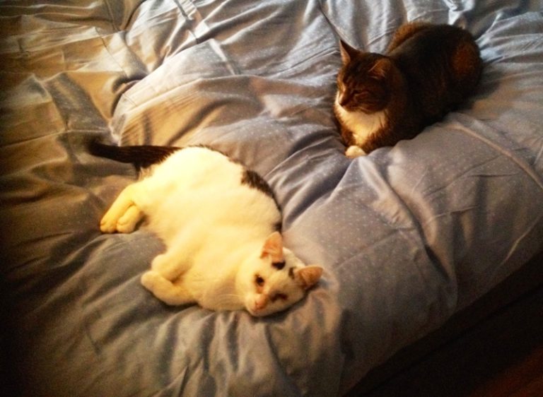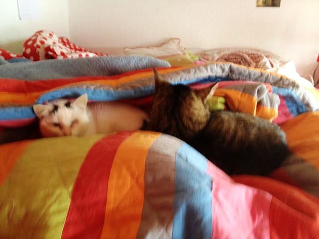 Ihr Katzenschnupfen ist – abgesehen von den noch etwas tränenden Augen – inzwischen symptomfrei. Mit Kater Kasimir versteht sie sich toll, die beiden sind auch in der neuen Wohnung meistens im gleichen Raum, oder schlafen auf dem gleichen Möbelstück. So unterschiedlich sie sind, es ist unglaublich schön die beiden zusammen zu erleben. Er begegnet ihr mit soviel Geduld und Nachsicht, wenn sie mit ihrer kindlichen Art auf ihn drauf klettert, weil sie nunmal auch dort liegen will, wo er liegt, oder sich beim Füttern so doll an ihm reibt, dass er fast umkippt.