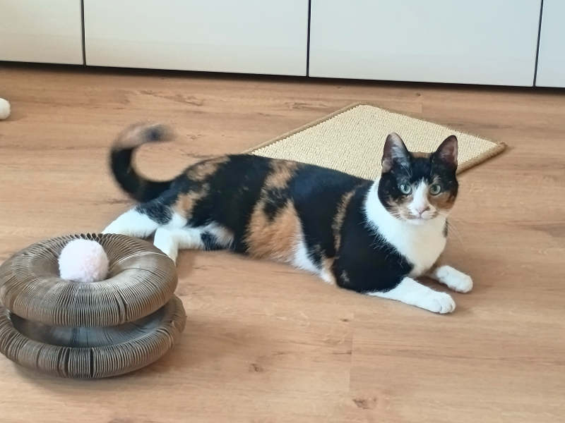 Sissy hat sich sehr gut entwickelt und im Oktober die Kastration auch gut überstanden. Leider hatte sie den Ansatz, in eine Dauerrolligkeit zu kommen. Mittlerweile hat sie schon ihr Normalgewicht von 3,5 kg erreicht. Sie ist nach wie vor sehr spielerisch und neugierig im Alltag.