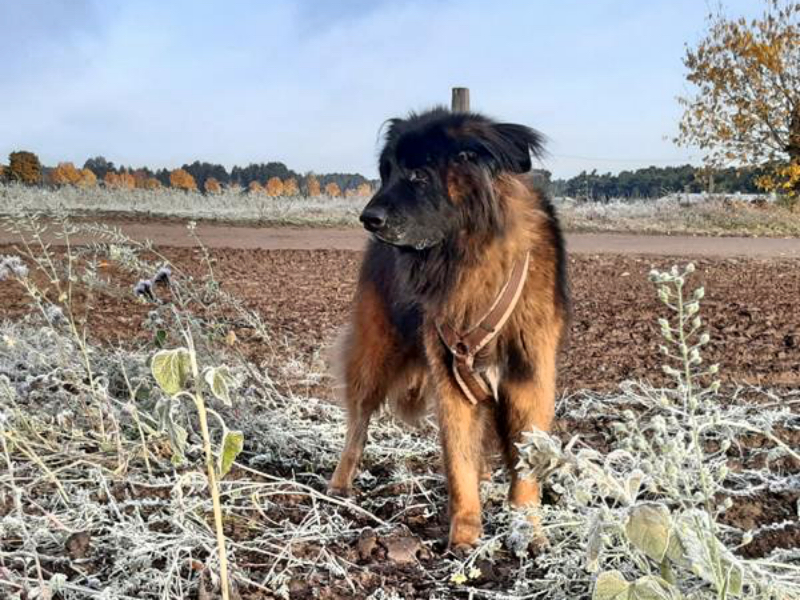 Auf unseren Spaziergängen ist er auch nicht mehr so misstrauisch wie zum Anfang. Zwischen den Häusern unseres kleinen Dorfes auf der Dorfstraße zu laufen, gefällt ihm nicht, aber im Wald ist er ein Dauerschnüffler. Und so sieht er die meisten Rehe und Hasen auch nicht immer, aber wenn, dann ist sein Jagdtrieb geweckt und dann ist er auch kaum zu halten.