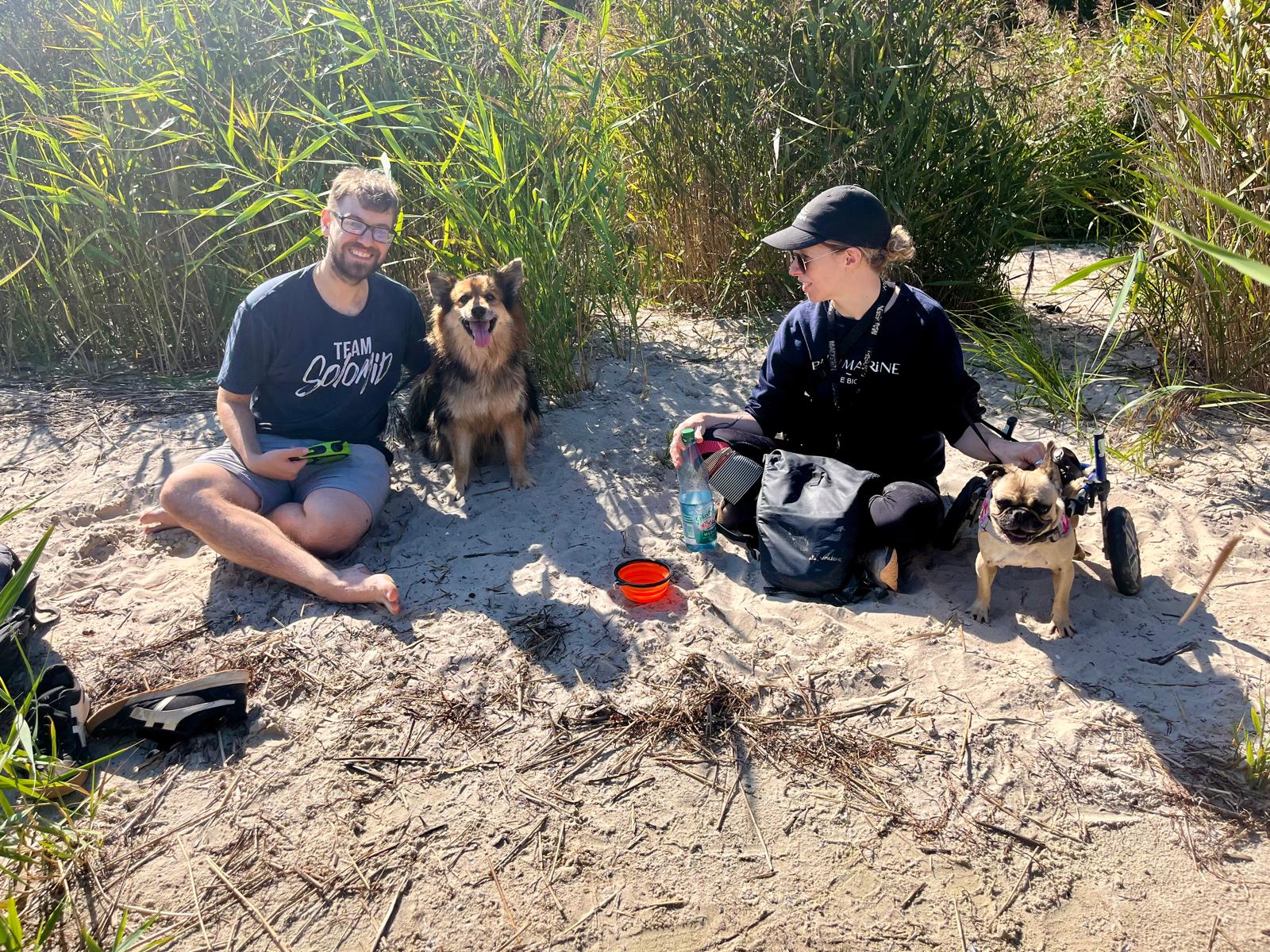 Maxe? Unser Musterschüler. Im Auto blieb der Magen brav bei sich, kein Gepolter, kein Gepfiepe. Am Strand dann die große Überraschung: Er traute sich tatsächlich mit den Vorderpfoten ins Wasser! Für einen selbsternannten Wassermuffel schon fast ein Weltrekord. Zwischendurch stand er lauernd im Schilf – vermutlich in der Hoffnung auf Wildtiere. Gefunden haben wir aber nur die etwas… freiheitsliebenden FKK-Fans.