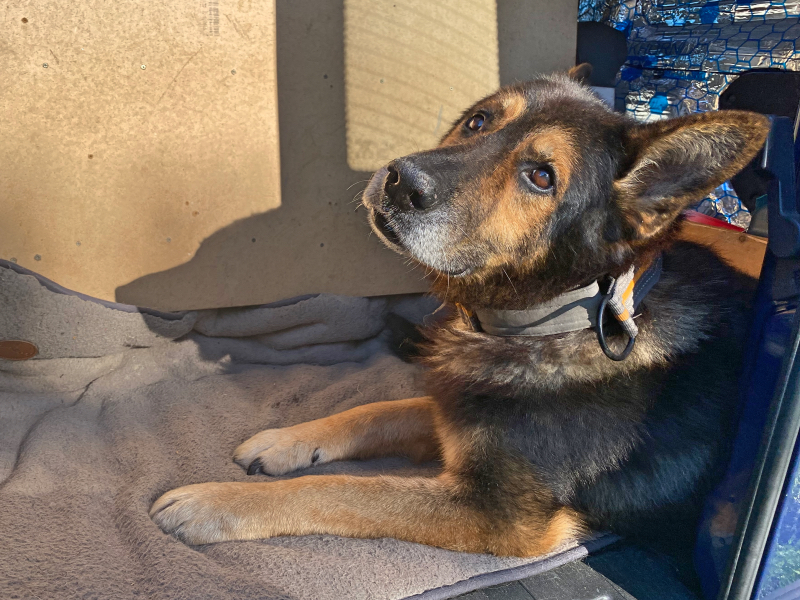 Die lange Reise zu uns auf den Gnadenhof nehmen die beiden gerne in Kauf. Auf dem Weg zu uns werden auch Freunde besucht und mehrere Stopps eingebaut. Charly ist ruhig und ausgeglichen und macht alles mit. Mit seinen 12 Jahren ist er ein idealer Reisebegleiter und immer an Richards Seite.