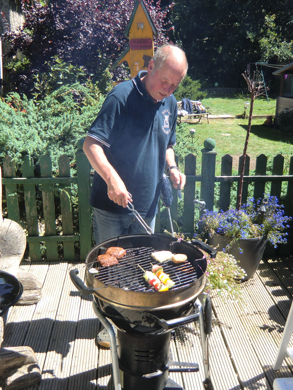 Richtig geschafft kamen wir nach ca. 2 Stunden wieder auf dem Gnadenhof an. Und da roch es auch schon lecker nach Gegrilltem! Manfred hatte für die hungrigen Wanderer schon eine Stärkung vorbereitet. Da viele Wanderlustige etwas Selbstgemachtes mitgebracht hatten – köstliche Salate, lecker Brot und die verschiedensten Aufstriche, Kuchen und vieles mehr – war für jeden Geschmack etwas dabei. Nachdem sich alle gestärkt hatten war noch genügend Zeit, interessante Gespräche zu führen, sich über unsere Arbeit zu informieren und natürlich unsere Gnadenhofbewohner mit Streicheleinheiten zu verwöhnen. Unser Jake nahm im „Pool“ dann auch noch einmal ein kleines Erfrischungsbad.