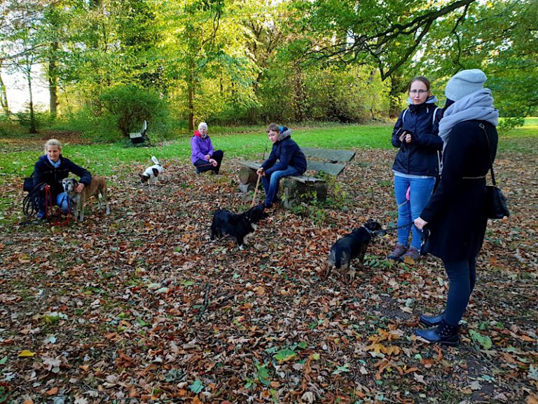 Die Sonne lachte den ganzen Tag, die Bäume zeigten sich in allen möglichen Farbkleidern und die Hundeführer?…glänzten nicht besonders was Ihren Orientierungssinn angeht. Nach mehrfachen Einschlägen von “falschen” Wegen fand die Truppe dann doch noch den ausgesuchten Pfad und fuhr nach Sprüngen in den Bach und über umgefallene Bäume sowie hingebungsvollem Wälzen an verschiedenen Stellen wieder gen Gnadenhof. Dort angekommen erwartete die ausgehungerten Gassigeher eine stärkende Tasse Kaffee und Kuchen und die Fellnasen ihr gemütliches Körbchen.